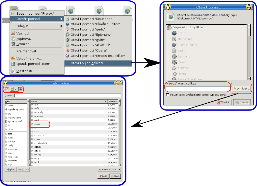 Na dalším obrázku je postup jak na to, když se nespokojím s nabídkou, kterou mi počítač nabízí. Mám v PC aplikaci, kterou chci soubor otevřít, ale Správce souborů mi ji nenabízí ve výběru. Sice jsem zakrouškoval opět "Abiword", i když ten je nabídnut, ale jde o vysvětlení.