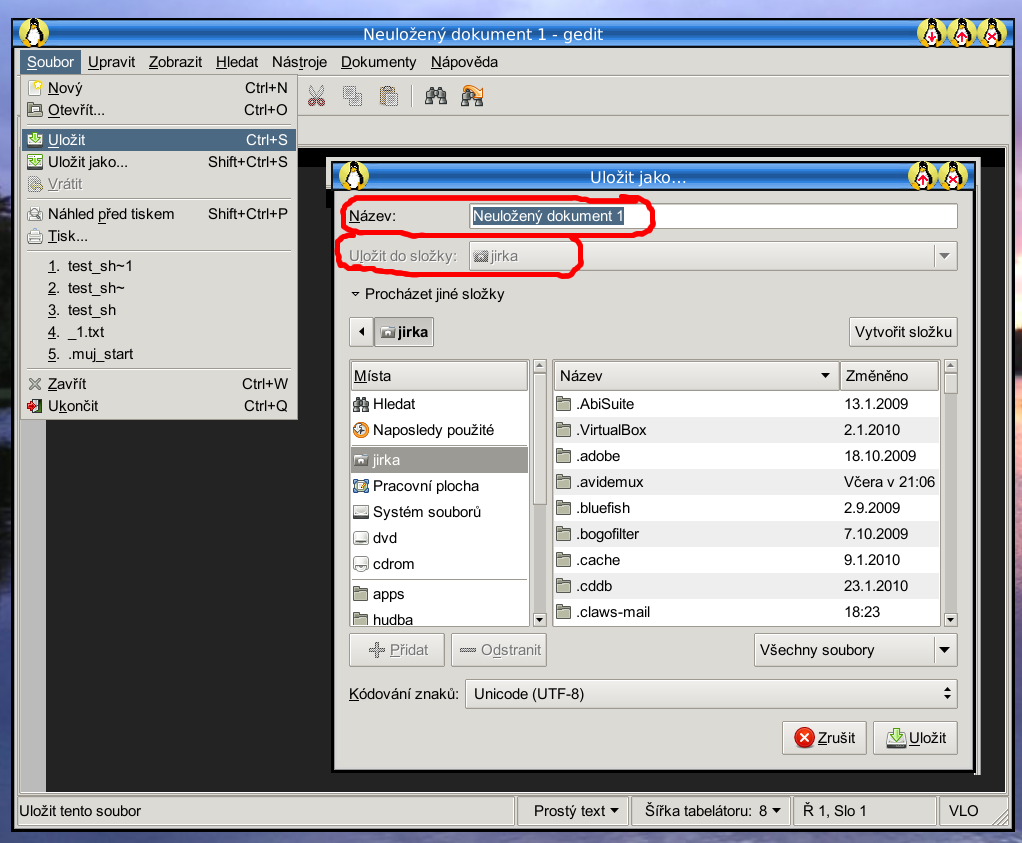 5. Oteřete si soubor ~/Test/pokus, který jsme si vytvořili a otevřete ho v aplikaci "Abiword" nebo "Openoffice-writer". A nyní soubor uložte