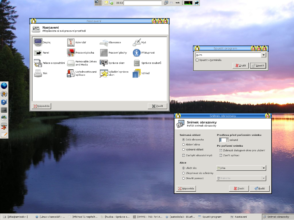 Nyní máme základní GUI kompletní, přesto ale součástí desktopového prostředí bývají i různé další nástroje. Jednak jsem už zmínil applety určené pro panel, ale to není samozřejmě vše. Na obrázku můžete vidět ovládací centrum (xfce4-settings-manager), ve kterém se dají provádět různá nastavení Desktopového prostředí. Dále pak je vidět jednoduchá příkazová řádka (jiná než je v panelu) určenou pro rychlé spouštění programů pomocí příkazu (xfrun4). Taktéž jsem spustil nástroj na vyfocení obrazovky (xfce4-screenshoter) - tentokrát jsem nepoužil applet v panelu, ale spustil jsem jej přímo z menu.